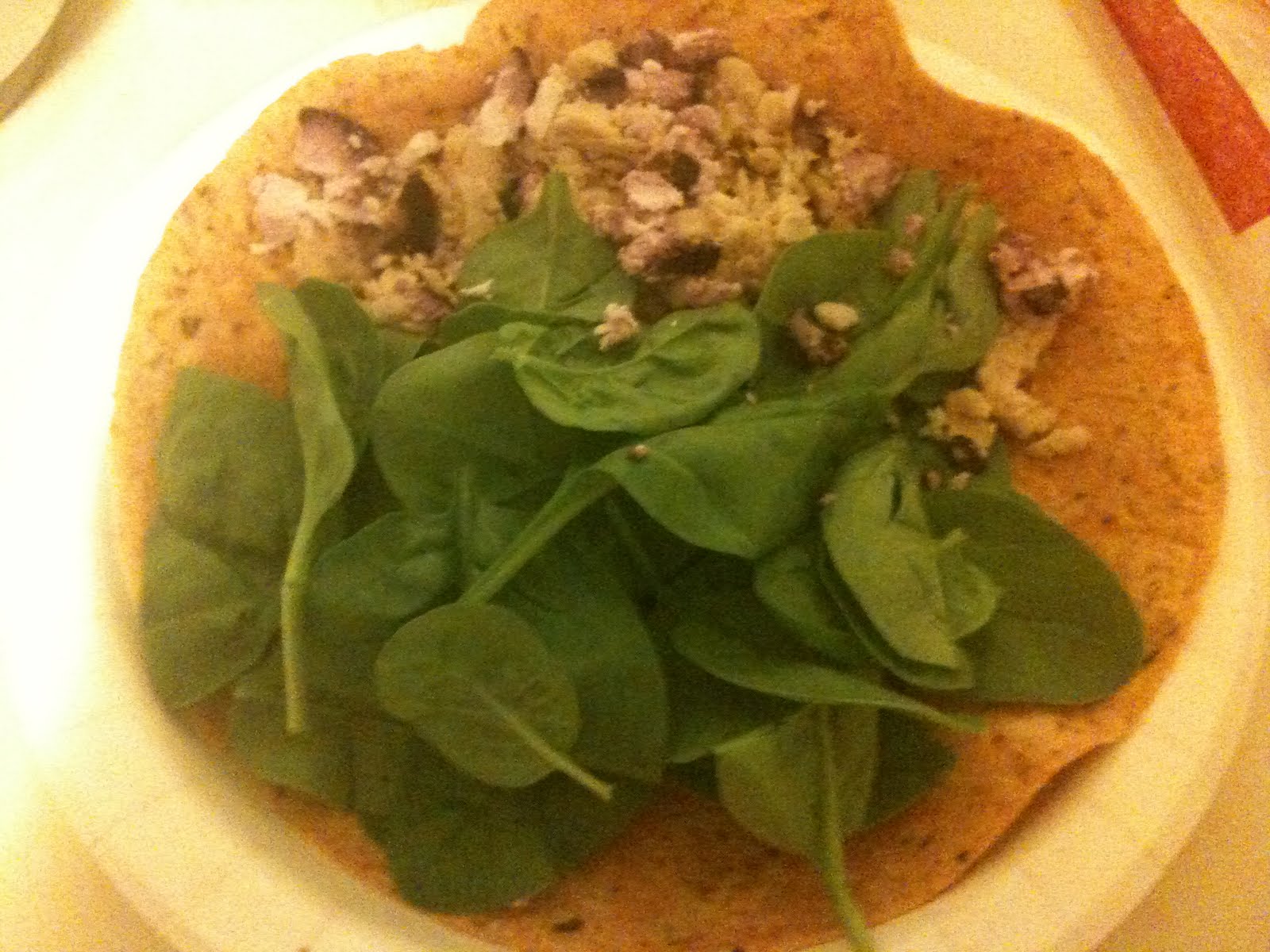 dinner: chicken salad with 1/2 egg white, tomatoes, mustard, guac hummus over spinach